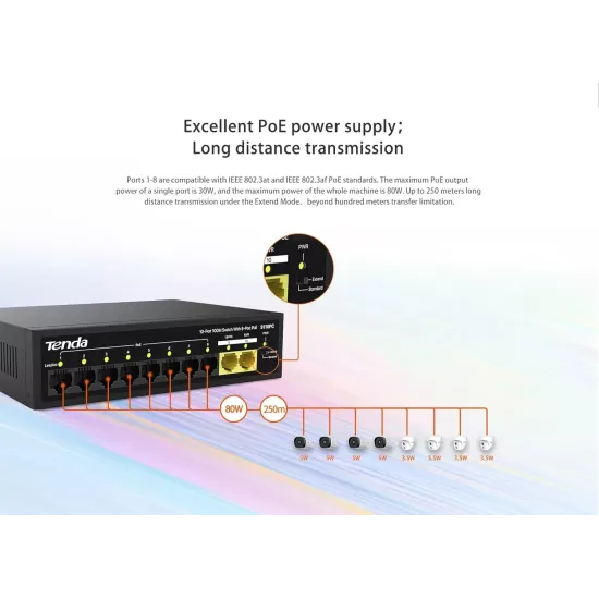| Interfaces | 8 * 10/100 Base-TX Ethernet Ports (Data/Power) 2 * 10/100 Base-TX Ethernet Port (Data) |
